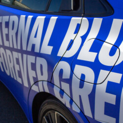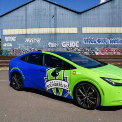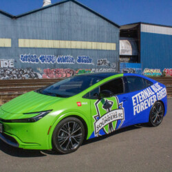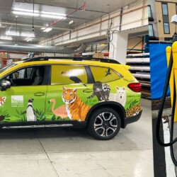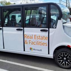 PVC-free fleet wrap on Microsoft zero-emissions car. With this fleet of zero-emissions cars, Microsoft wished to highlight their efforts of reducing emissions overall and specifically in their campus communities. SuperGraphics used an Ecoformat™ PVC-free self-adhesive film to produce the graphics, making any pre or post-production waste of the project recyclable.